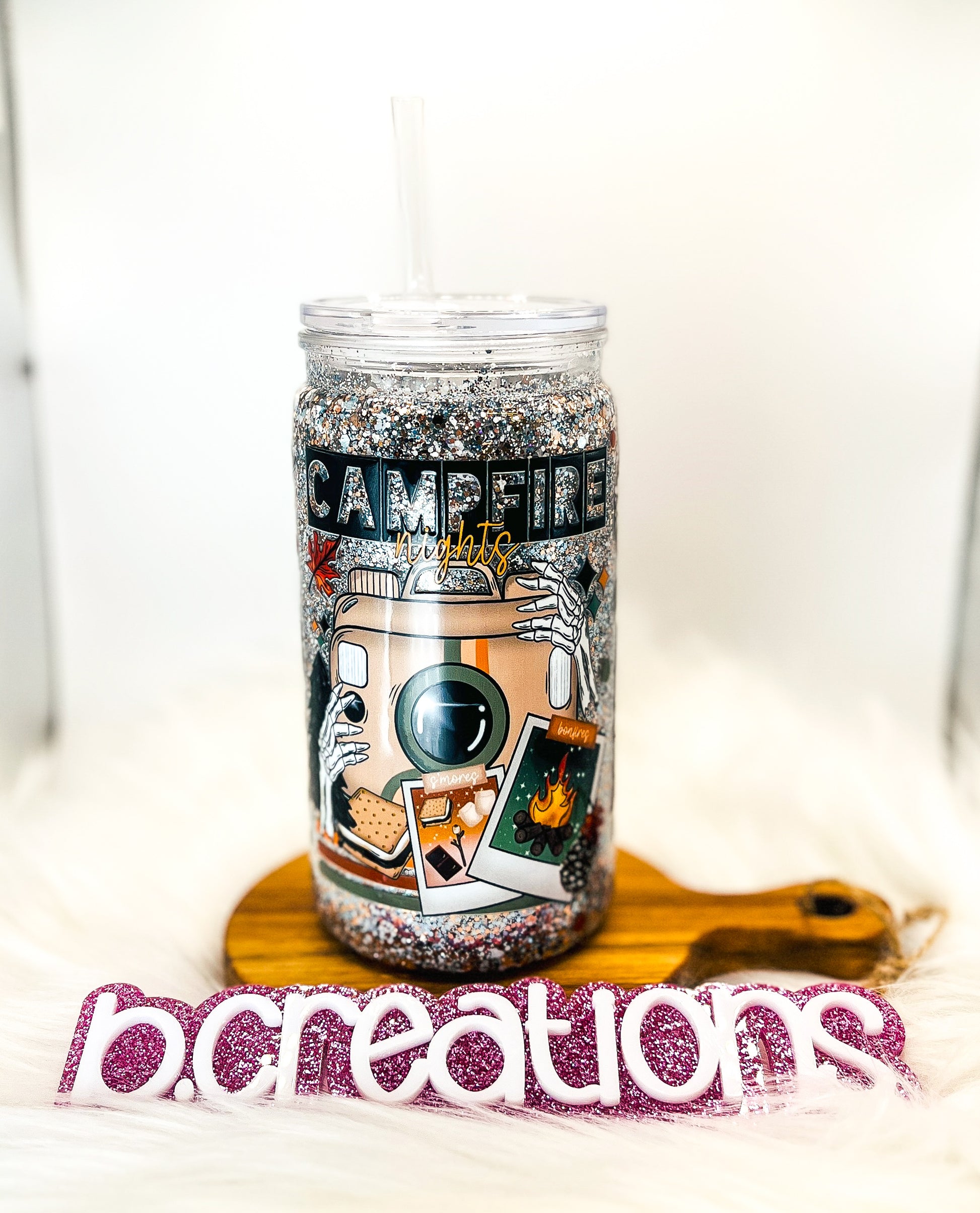 Camping Snow Globe tumbler, 16 oz tumbler, Snow Globe Glitter Tumbler